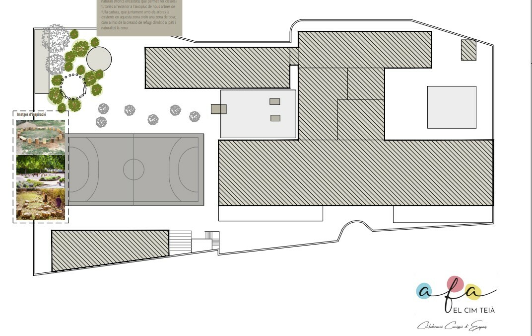 Naturalitzar espai del pati gran de l'escola El Cim, creant un espai tipus àgora amb arbres en edat adulta, que proporcionin ombra inmediata o a curt plaç, L'objectiu és introduir la natura al pati, adaptant-nos al canvi climàtic per la regulació de les condicions ambientals que els arbres proporcionen i la millora de l'habitabilitat. Guanyar en biodiversitat i crear un espai per la pràctica educativa