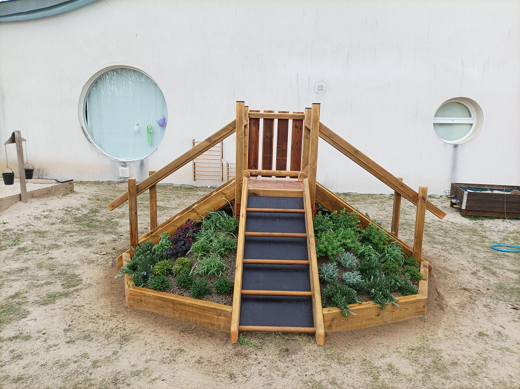 Una estructura amb desnivells beneficiós per al sistema motriu dels nens i nenes i amb una zona on, en un futur, es podrà plantar flors i plantes aromàtiques.